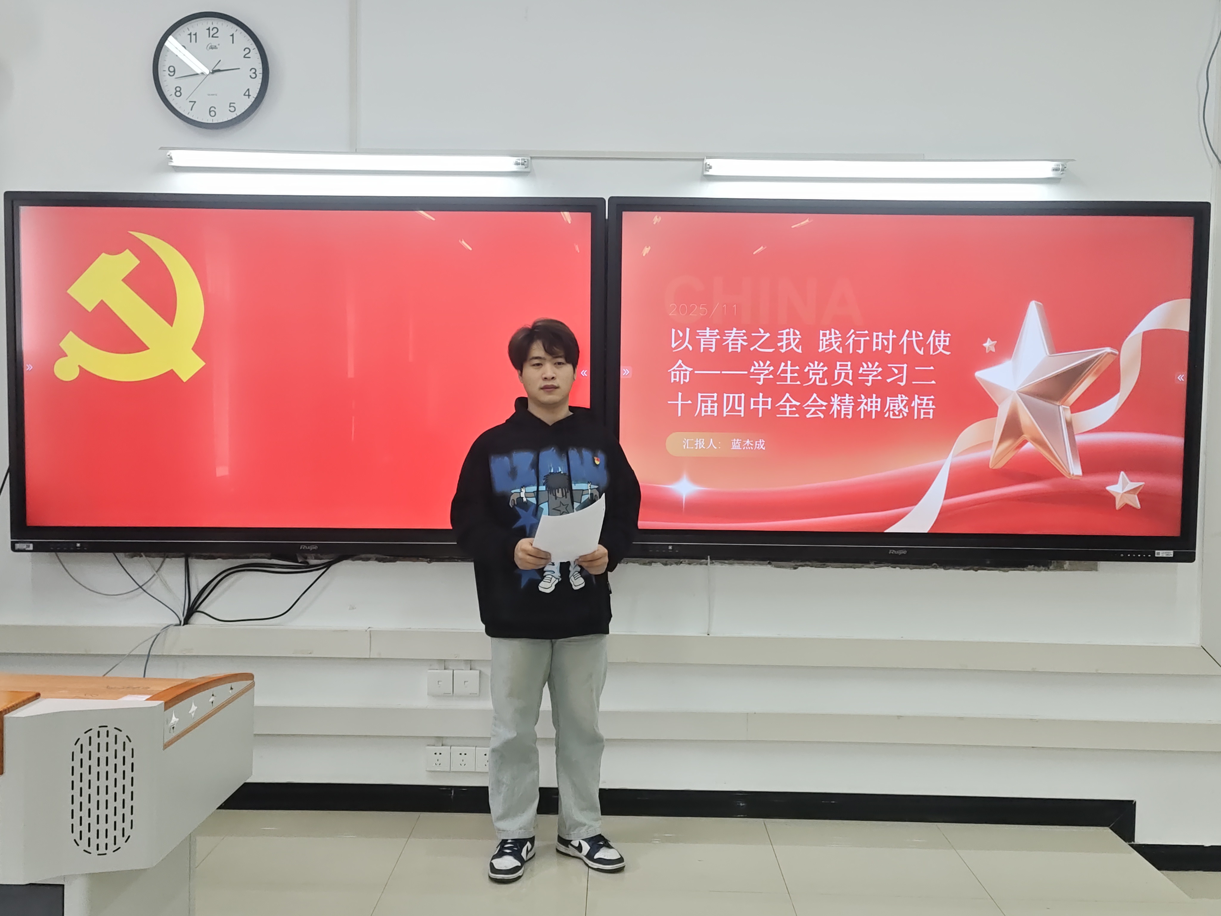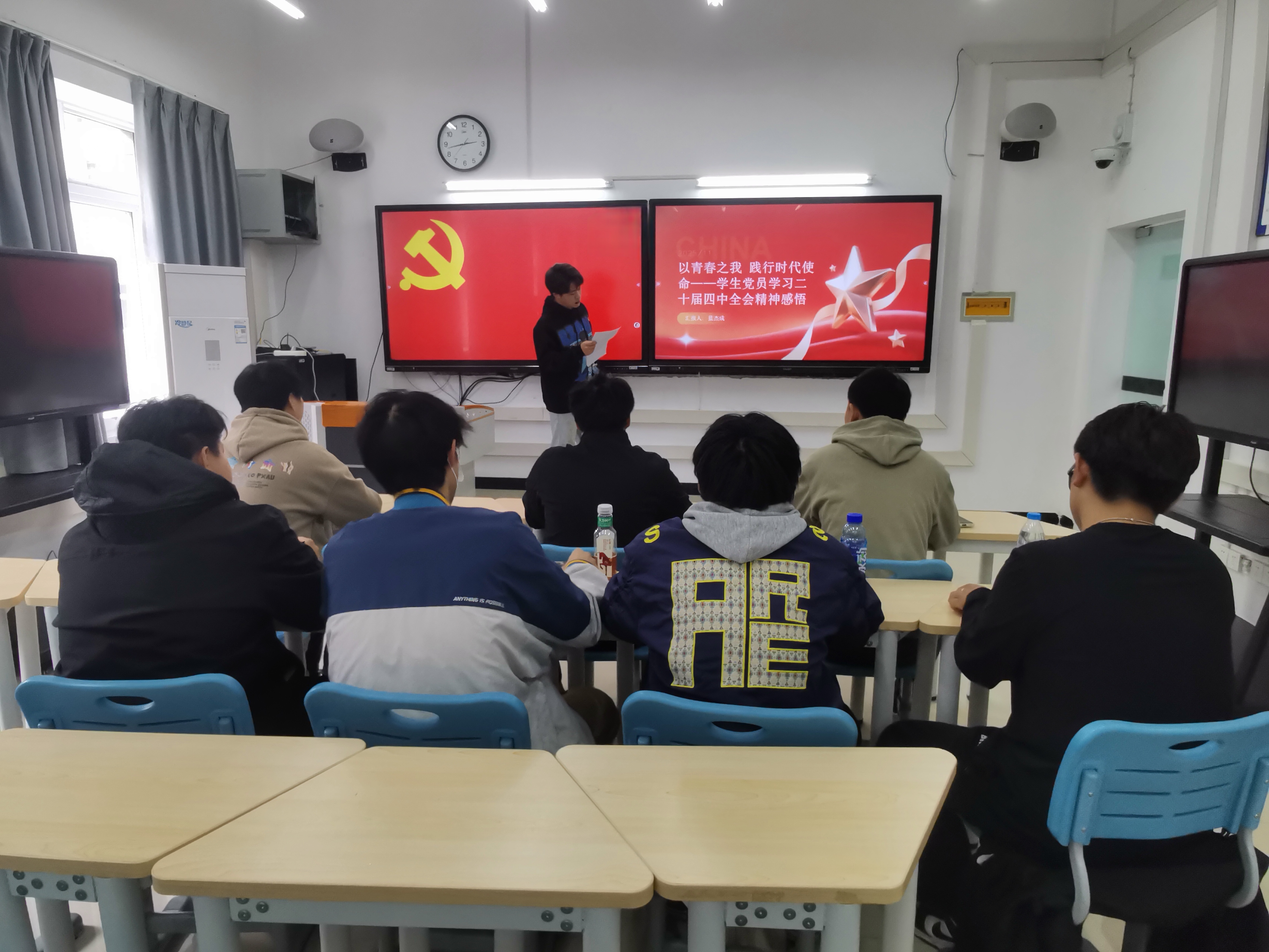 为推动二十届四中全会精神在青年党员群体中落地生根,引导学生党员把个人理想融入国家发展大局,建筑与土木工程学院学生第四党支部于2025年11月13日中午12:30,在一教316教室开展以“以青春之我,践行时代使命”为主题的组织生活。本次会议由蓝杰成同志主持,支部书记郑昊及支部全体党员同志参会。 会议伊始,蓝杰成同志以全会的历史方位与战略部署为切入点,系统解读了此次全会在“十四五”收官与“十五五”启幕关键节点的重大意义。他围绕2035年基本实现社会主义现代化的战略目标,深入阐释了坚持党的全面领导、人民至上、高质量发展等核心原则,并聚焦科技自立自强、国家安全屏障、社会治理现代化等重点任务。结合全会公报中“发展”“安全”“创新”等高频词汇,他生动诠释了国家对青年一代的殷切期待与时代要求。 会上,蓝杰成同志结合不同专业特色,明确了学生党员的实践方向。鼓励国际政治相关专业党员可助力人类命运共同体构建,理工科专业当立志攻关“卡脖子”技术难题。他强调,学生党员作为新时代青年先锋,既是中国式现代化建设的直接参与者,也是发展成果的受益者,必须以“两个确立”为根本遵循,增强“四个意识”、坚定“四个自信”、做到“两个维护”,在复杂环境中筑牢思想根基。 会议最后,支部书记郑昊作总结。他指出,二十届四中全会为“十五五”乃至更长时期的发展指明了清晰方向,“发展”“安全”“创新”的时代命题,正是青年党员施展才华、建功立业的广阔舞台。希望大家牢记习近平总书记的殷切嘱托,以昂扬姿态,将个人理想深度融入国家发展大局,在推进中国式现代化建设的伟大征程中,书写无愧于时代的青春华章!