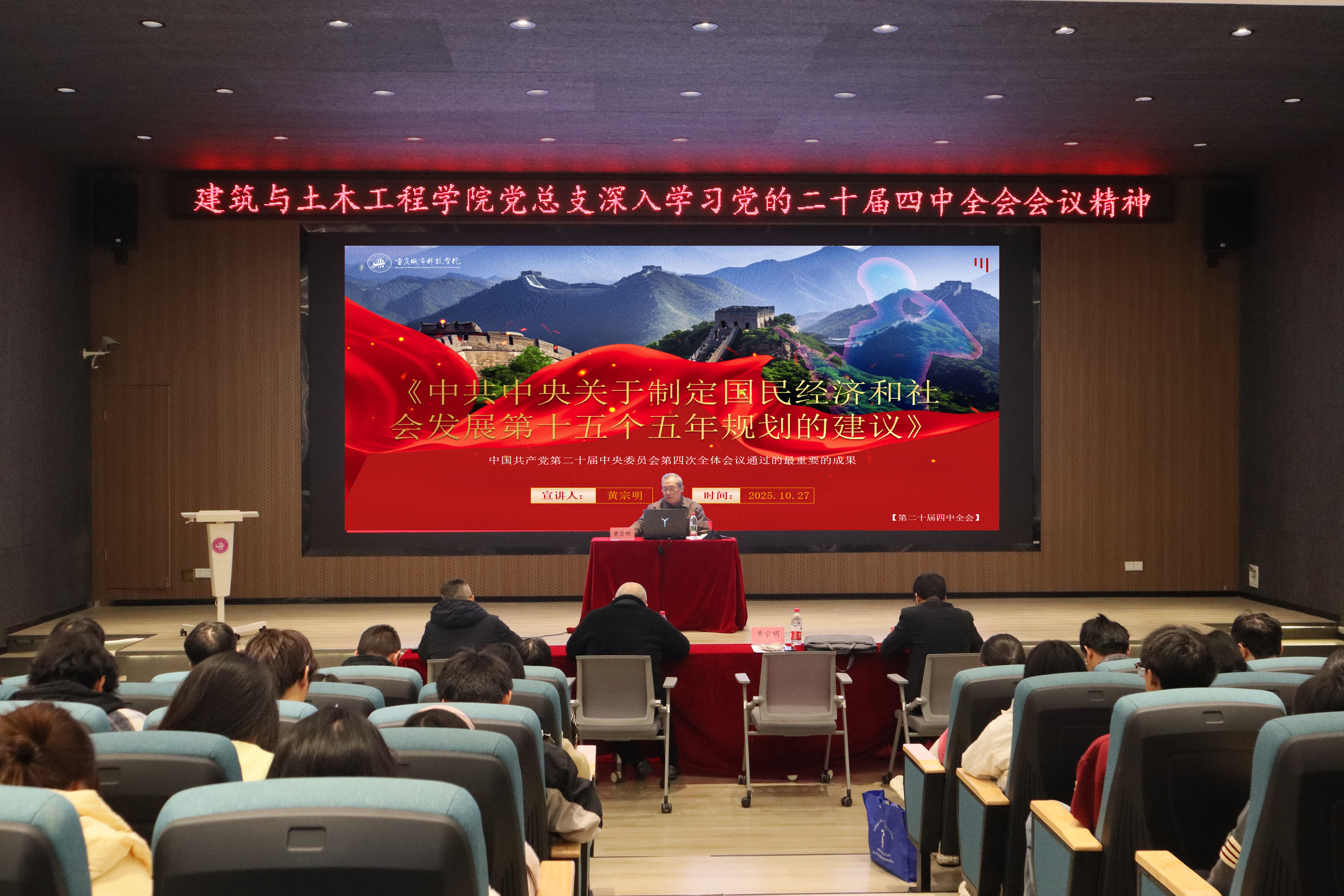为深入学习贯彻党的二十届四中全会精神,推动《中共中央关于制定国民经济和社会发展第十五个五年规划的建议》(以下简称《“十五五”规划建议》)落地生根,强化青年党员廉洁自律意识与使命担当,引导广大师生将个人理想融入国家发展战略,建筑与土木工程学院党总支于2025年11月26日15:00,在一教求是堂开展专题党课学习。本次党课由黄宗明校长主讲,学院院长赵万民,党总支书记陈宣君,党总支统战委员、学院院长助理杨龙龙及学院全体教职工党员、学生党员、学生团员代表参加,会议由陈宣君书记主持。 会议伊始,黄宗明校长以党的二十届四中全会精神的时代内涵为切入点,首先介绍了党的二十届四中全会的基本概况,指出会议于2025年10月20日至23日在北京举行,是“十四五”目标即将圆满完成、社会主义现代化基本实现的关键阶段所召开的一次重要会议;随后他概述了《“十五五”规划建议》主要内容,勉励青年党员将个人发展融入国家大局,在服务“十五五”规划实施中担当作为。 在解读“十四五”成就与“十五五”形势时,黄宗明校长指出,“十四五”时期我国在“五位一体”总体布局、“四个全面”战略布局推进中取得历史性成就,经济实力、科技实力等跃上新台阶,为“十五五”时期发展奠定坚实基础。他强调,“十五五”时期承前启后、关乎社会主义现代化建设全局,机遇与挑战并存,青年党员需深刻把握“六个坚持”原则(坚持党的全面领导、人民至上、高质量发展、全面深化改革、有效市场和有为政府相结合、统筹发展和安全),以坚定的政治站位践行发展要求。 结合国家战略与教育使命,黄宗明校长强调,教育是国之大计、党之大计,高校作为人才培养主阵地,肩负着为国家输送高素质专业化人才的重要使命。他指出,《“十五五”规划建议》明确的高质量发展、科技自立自强等目标,与建筑与土木工程领域紧密相关——该领域作为实体经济重要支撑,是现代化产业体系建设、美丽中国建设和民生改善的关键载体。他寄语青年党员:“学院始终以服务国家战略、培养时代新人为己任,希望大家立足专业所长,深耕绿色建筑、智能建造等新质生产力相关领域,在技术创新中锤炼过硬本领,将专业能力转化为服务区域协调发展、民生品质提升的实际成效,以实干精神助力‘十五五’规划落地。” 学习尾声,黄宗明校长强调,全体党员要以党的二十届四中全会精神为指引,始终坚持党中央集中统一领导,以党自我革命的精神引领成长之路;教师党员要牢记为党育人、为国育才初心使命;学生党员要践行强国有我、挺膺担当时代责任,共同将《“十五五”规划建议》部署转化为教学科研与学习实践的行动自觉,把个人理想融入国家发展大局,以教育担当、青年担当为民族复兴伟业贡献力量。 学院将以此次学习为引领,深学笃行二十届四中全会精神,锚定民族复兴与国家发展大局,把学习成果转化为育人实效与奋进动能:坚持以党建为魂强根基,以专业为要育人才,以廉洁为基正风气,引领师生将个人理想融入国家发展伟业,为“十五五”规划实施、学院高质量发展与民族复兴贡献青春力量。