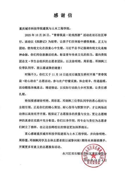 当永川区双石镇双存社区居民委员会的感谢信翩然送达重庆城市科技学院建筑与土木工程学院,纸页间流淌的不仅是诚挚谢意,更是对建土青年志愿担当的深情礼赞,为校社同心的温暖联结镌刻下鲜明印记。 回望这段双向奔赴的公益旅程,从“砼戏西游”活动中以经典为桥,为孩童播撒传统文化的种子、传递勇敢正义的力量,到“砼心助农”行动里躬身田间,以柠檬采摘的实干助力乡村发展、诠释责任担当,建筑与土木工程学院团总支·学生会的志愿者们将青春热忱化作触手可及的温暖。 这份感谢信,既是对过往多次志愿活动的充分认可,更凝聚着社区对未来深度合作的殷切期盼,让我们深切体悟到:公益从不是孤军前行的步履,而是校社携手、以心换心的同行之路。 这纸沉甸甸的肯定,既是过往付出的荣光见证,更是未来深耕公益的崭新起点。在此,我们向双存社区居民委员会致以诚挚谢意,也向全体志愿者的坚守致敬。愿继续以志愿为绳、砼心聚力,让文化传承的微光与助农兴村的暖意交织成炬,让青春担当在更多基层土壤中生根结果,让校社同心的善意之花,在共建共享中绽放出更持久、更绵长的芬芳。