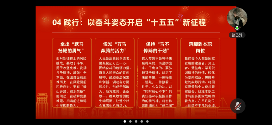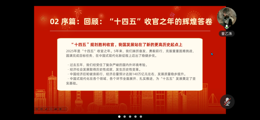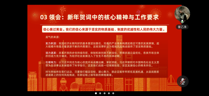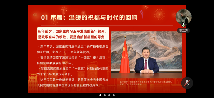 为深入学习贯彻国家主席习近平二〇二六年新年贺词精神,引导全体党员深刻领会贺词中蕴含的坚定信念、科学思维、人民立场与时代使命,凝聚思想共识,激发奋斗力量,建筑与土木工程学院学生第一党支部于2026年1月16日中午12:20在线上开展以“跃马扬鞭启新程,解码贺词聚伟力”为主题的组织生活。本次会议由曾乙洙同志主持,支部书记梅本婷及全体党员参会。 会议伊始,曾乙洙同志带领大家系统回顾了国家主席习近平二〇二六年新年贺词的核心内容。贺词回望了“十四五”时期所取得的辉煌成就,深刻阐述了新质生产力作为发展核心动能的重大意义,彰显了科技自立自强、民生持续改善、开放共赢发展的生动实践。同时,贺词描绘了“十五五”时期的宏伟蓝图,发出了奋进中国式现代化新征程的动员令,这不仅是一份温暖厚重的历史答卷,更是一篇指引前进方向的纲领性文献。 紧接着,会议强调要准确把握贺词中蕴含的核心精神。一是要深刻领悟“不可动摇的中国信心”,这份信心源自坚实的发展基础、显著制度优势和人民的磅礴力量;二是要紧紧抓住“发展新质生产力”这一核心动力,将创新置于现代化建设全局核心;三是要始终坚守“以人民为中心”的根本立场;四是要持续推进“党的自我革命”,永葆党的先进性和纯洁性;五是要切实扛起“‘十五五’开好局起好步”的时代使命,将宏伟蓝图转化为务实行动。 随后,曾乙洙同志指出,作为新时代学生党员,应从贺词精神中汲取养分,内化于心、外化于行。发扬“跃马扬鞭”的斗争精神,面对困难敢于攻坚克难;激发“万马奔腾”的创新活力,在专业领域积极探索;保持“马不停蹄”的实干作风,力戒空谈,注重实效;立足“平凡岗位”创造非凡价值,将宏伟蓝图细化为日常学习、社会服务的具体行动中。 在支部党员讨论分享环节中,陈韵涵同志分享到:“新年贺词既是温暖人心的祝福,更是催人奋进的号角,新时代党员要持续深化理论武装,强化使命担当,以奋斗姿态,在‘十五五’新征程上跃马扬鞭、砥砺前行,努力成为有理想、敢担当、能吃苦、肯奋斗的新时代青年。” 会议最后,支部书记梅本婷作总结发言。她强调,全体党员要持续深入学习领会国家主席习近平新年贺词的精神实质,将其作为学习或工作的重要遵循。要进一步提高政治站位,凝聚团结奋斗合力,以“起步即冲刺”的劲头,在新时代新征程上奋力谱写新篇章。