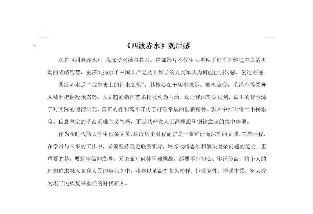 为进一步强化党员的奉献与担当精神,树立正确历史观,坚定理想信念,建筑与土木工程学院学生第五党支部于2025年12月23日开展以“铭记伟人智慧,勇担时代使命”为主题的十二月党日活动。此次活动采用支部同志自行观看电影《四渡赤水》并撰写观后感的形式开展,支部全体党员同志参与。 电影《四渡赤水》以1935年遵义会议后,中央红军在长征途中面临国民党军队重重围堵的生死存亡关头为背景,生动再现了以毛泽东、周恩来、朱德为代表的老一辈无产阶级革命家的军事指挥艺术,领导红军灵活机动、出奇制胜的辉煌战例。影片描绘了红军在川黔滇边境的赤水河畔,面对数十万敌军的围追堵截,四次飞渡赤水河,成功摆脱战略被动,夺取战略主动的伟大历程。这部电影不仅展现了革命先辈坚定的理想信念和无畏的牺牲精神,更深刻诠释了“实事求是、灵活机动”的军事思想与斗争智慧,是广大党员干部学习党史军史、感悟初心使命、汲取奋进力量的生动教材。 《四渡赤水》重现了那段决定中国革命命运的传奇历史。影片以精湛手法的叙事和磅礴的视听语言,激发了观众对红军将士的深深敬意,以及对毛泽东军事思想精妙的叹服。创作团队怀着高度的历史责任感,精心雕琢这部作品,旨在传承红色基因,弘扬不怕艰难险阻、坚信正义事业必胜的革命乐观主义精神。通过影片的深刻感染力,我们坚信能够进一步筑牢党员同志的信仰之基,激励大家在新时代的征程上,发扬斗争精神,增强斗争本领,为实现中华民族伟大复兴的中国梦贡献智慧与力量。 观看影片后,支部党员同志积极撰写感悟体会,分享观影收获。 付杰同志分享到:“《四渡赤水》让我深刻感受到了革命领袖在绝境中展现出的惊人智慧与战略眼光。影片中,红军以小搏大、以弱胜强,每一次渡河都不是简单的转移,而是环环相扣、谋定后动的妙棋。这让我深刻认识到,在工作中遇到复杂局面时,必须保持清醒头脑,深入分析,创造性地寻找解决方案。”唐渔同志表示:“《四渡赤水》不仅是一部波澜壮阔的战争史诗,更是一次深刻的辩证法教育。它让我明白,暂时的后退是为了更好地前进,局部的牺牲是为了换取全局的胜利。影片中领袖与战士同心同德、军民鱼水情深的画面,诠释了‘人民是历史的创造者’的真谛。这启发我,在任何时候都要紧密联系群众,依靠集体智慧,担当起时代赋予的责任。” 此次主题党日活动,通过观看《四渡赤水》,有效增强了党员同志们的历史自豪感与战略思维意识,使大家对党的奋斗历程和宝贵经验有了更为深刻的认知。影片中革命先辈在危机中孕育新机、于变局中开新局的非凡实践,激励着每一位党员在各自的学习与工作岗位上,坚守初心、开拓创新、积极作为。未来,建筑与土木工程学院学生第五党支部全体党员同志们将继续秉持这种精神,铭记光辉历史,汲取智慧力量,以实际行动践行共产党员的初心使命,勇敢迎接前进道上的各项挑战。