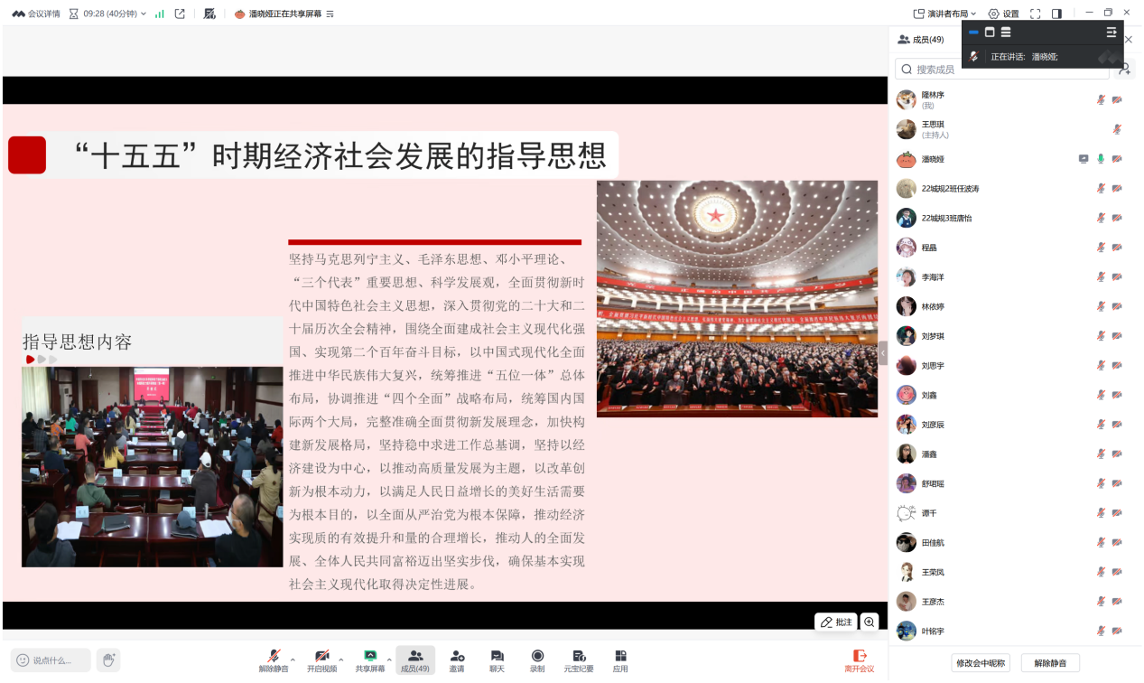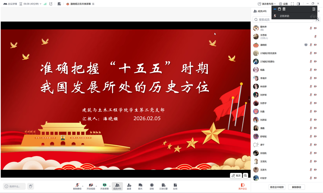 为深入学习党的二十届四中全会精神,准确把握“十五五”时期我国发展所处的历史方位,引导支部党员将个人理想融入国家发展大局,勇担中国式现代化建设使命,建筑与土木工程学院学生第二党支部于2026年2月5日中午12:25开展线上组织生活。会议由潘晓娅同志主持,支部书记成曼及支部全体党员参加。 会议伊始,潘晓娅同志围绕“十五五”时期我国发展的历史方位展开系统解读。她以历史进程为脉络,详细梳理了党的十八大以来我国完成全面建成小康社会历史任务、实现第一个百年奋斗目标的重大成就,以及党的十九大、二十大作出的“两步走”战略安排,阐明了“十五五”时期作为衔接“十四五”与“十六五”、为2035年基本实现社会主义现代化夯实基础的关键定位。她强调,“十五五”时期的“夯实基础”,核心是巩固优势、破除瓶颈、补强短板,让发展根基更稳、韧性更强,全体党员需站在中国式现代化的历史进程中深刻把握这一阶段的重大意义。 紧接着,潘晓娅同志结合世界百年变局的深刻演进,分析了“十五五”时期我国面临的发展环境。她指出,当今世界动荡变革加剧,单边主义、保护主义冲击国际规则,但新一轮科技革命和产业变革加速演进也带来新的发展机遇,确定性与不确定性交织并存。对此,我国既要放眼世界积极识变应变求变,在国际竞争中赢得战略主动,更要立足国内集中力量办好自己的事,以高质量发展的确定性应对外部环节的不确定性。她结合“六个坚持”原则,深入阐释了党的全面领导这一根本保证、人民至上这一价值立场,以及高质量发展、全面深化改革等核心要求的丰富内涵,使支部党员们对发展指导方针有了系统认知。 随后,王荣凤、毛婷婷等同志结合自身学习与专业特色分享感悟。王荣凤同志表示,“十五五”规划提出的构建新发展格局、发展新质生产力等部署,与建筑行业的绿色转型、智能建造发展高度契合,作为新时代青年,将主动深耕绿色建筑、工程数字化等领域,把专业所学融入产业升级浪潮。毛婷婷同志谈到,“十五五”时期统筹发展和安全的要求,对城乡规划、工程建设具有重要指导意义,未来将在实践中强化风险意识,注重工程质量与安全管控,以专业能力服务“宜居中国”建设。与会党员纷纷表示,将主动学习“十五五”规划相关政策,提升综合素养,在科技创新、民生保障等领域贡献青年力量。 会议最后,支部书记成曼作总结发言。她强调,准确把握“十五五”时期的历史方位,是青年党员践行使命的前提。面对这一关键发展阶段,全体党员要做到三点:一是坚定理想信念,深刻领悟“十五五”规划背后的制度优势与战略智慧,增强投身中国式现代化建设的使命感;二是提升能力本领,既要深耕专业领域,紧盯智能建造、乡村振兴等国家战略需求,也要拓宽视野,学习新发展理念、国际规则等相关知识;三是积极投身实践,通过科研创新、志愿服务、企业实习等方式,将学习成果转化为实际行动,在推进科技创新、民生改善、安全发展等实践中勇挑重担。她鼓励全体党员以“功成不必在我,功成必定有我”的担当,在“十五五”规划实施的关键时期绽放青春光彩。