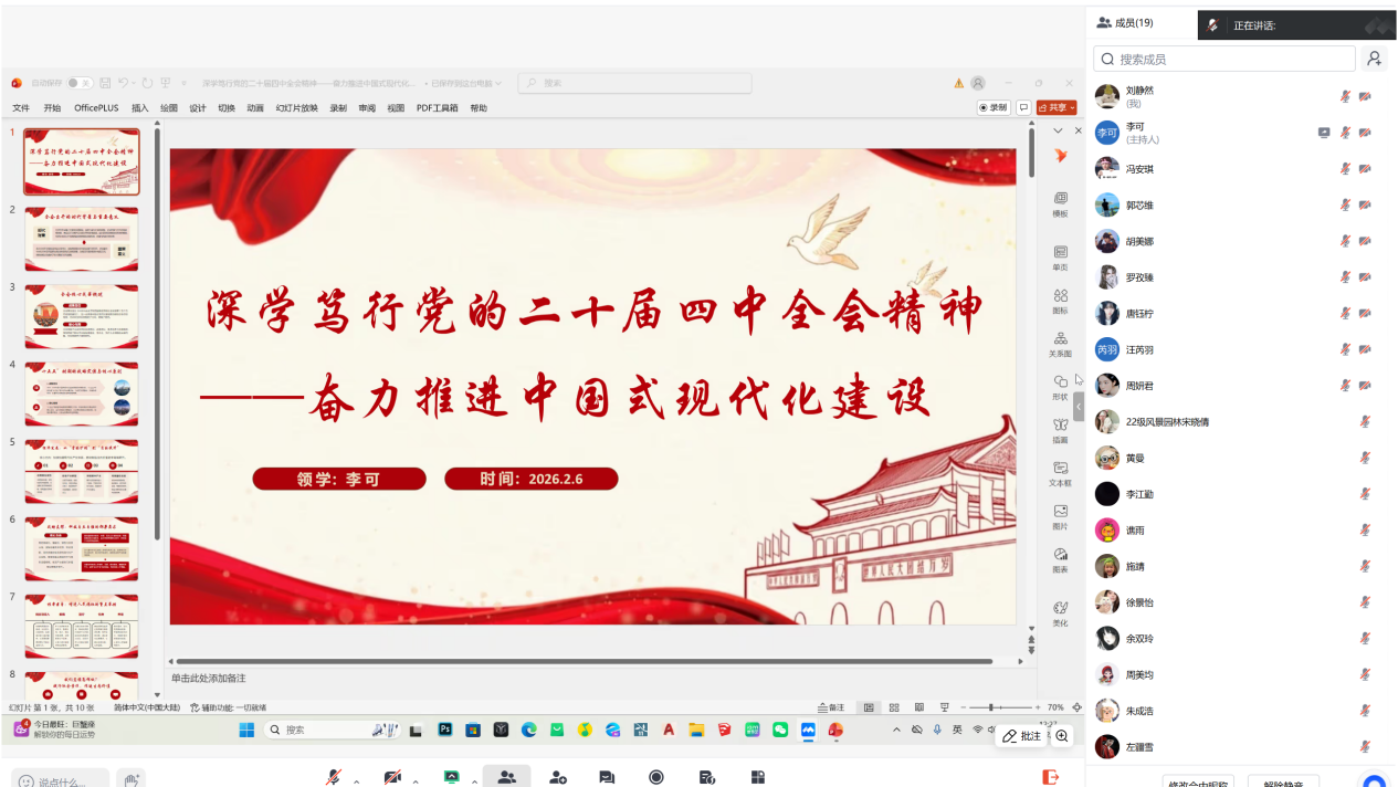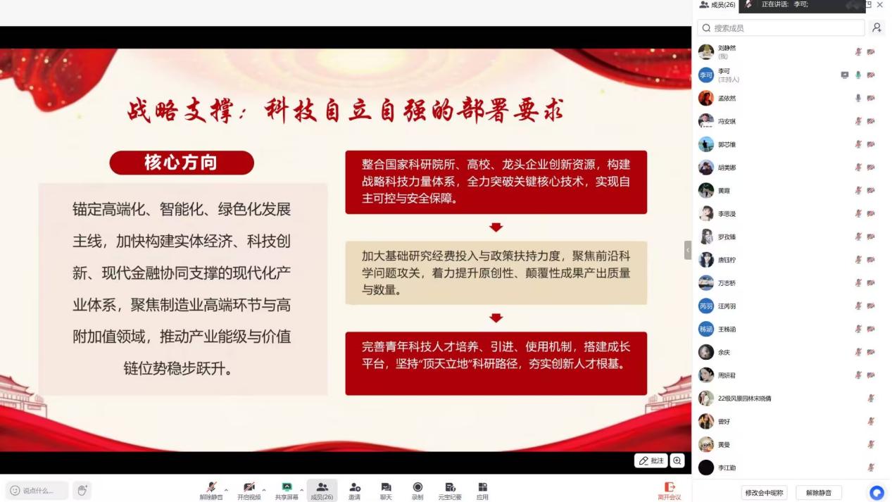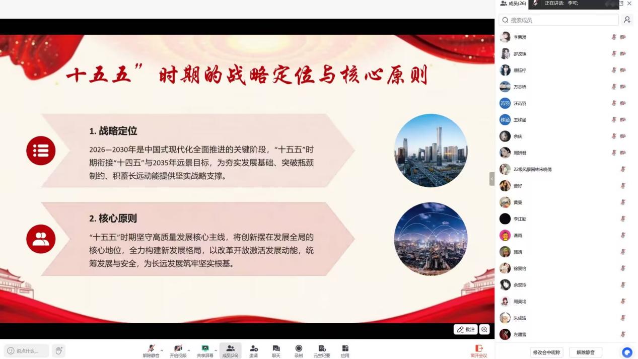 为全面学习贯彻党的二十届四中全会精神,深刻把握中国式现代化的科学内涵与实践路径,引领支部成员统一思想行动,凝聚奋进力量,建筑与土木工程学院学生第三党支部于2026年2月6日12:30开展线上专题学习,此次会议由宋晓倩同志主持,李可同志领学,学生第三党支部书记万志桥及全体成员参加。 会议伊始,李可同志首先阐述了党的二十届四中全会的重大意义与核心内容,系统解读了全会关于深化改革开放、推动高质量发展、推进国家治理体系和治理能力现代化等方面的战略部署。其中,他重点分析了中国式现代化的本质要求,并结合建筑与土木工程行业在新型城镇化、绿色低碳发展、基础设施建设等领域面临的机遇与责任,强调青年党员需深刻领会党中央的战略目标,将专业学习与国家发展蓝图紧密对接。 在交流研讨环节,党员同志们围绕如何在专业领域贯彻落实党的二十届四中全会精神进行了讨论。朱成浩同志表示:“作为风景园林专业学生,经过此次学习,我认识到必须将绿色发展理念深植于专业技能之中,未来参与基础设施建设时,应努力探索减少工程碳足迹的可行路径,从而将中国式现代化本质要求转化为实际行动。”周美均同志则谈到:“学习二十届四中全会精神使我更深刻理解科技自立自强的重要性。在建筑设计中,我们不仅要注重空间功能,更要主动学习应用数字孪生等前沿技术,为发展新质生产力贡献专业智慧。” 最后,支部书记万志桥进行总结发言。他对学习内容进行了梳理,并对支部成员提出了三点要求:一是要持续深入系统学习党的创新理论,特别是关于中国式现代化的重要论述,要不断提升政治判断力、政治领悟力、政治执行力;二是要坚持“学思用”贯通,将二十届四中全会精神的学习成果转化为扎实的专业能力和清晰的职业规划,关注行业前沿,练就服务现代化建设的过硬本领;三是要强化担当意识,自觉将个人发展融入国家发展大局,未来在建筑设计、工程建设、技术创新等岗位上恪尽职守,发挥先锋模范作用。 此次专题学习会,不仅让支部成员深化了对二十届四中全会精神的理解,明晰了专业与国家发展的结合点,更有效推动了理论学习与专业实践相融,激励大家以实干践行使命,将青春力量融入行业发展与中国式现代化建设征程中。