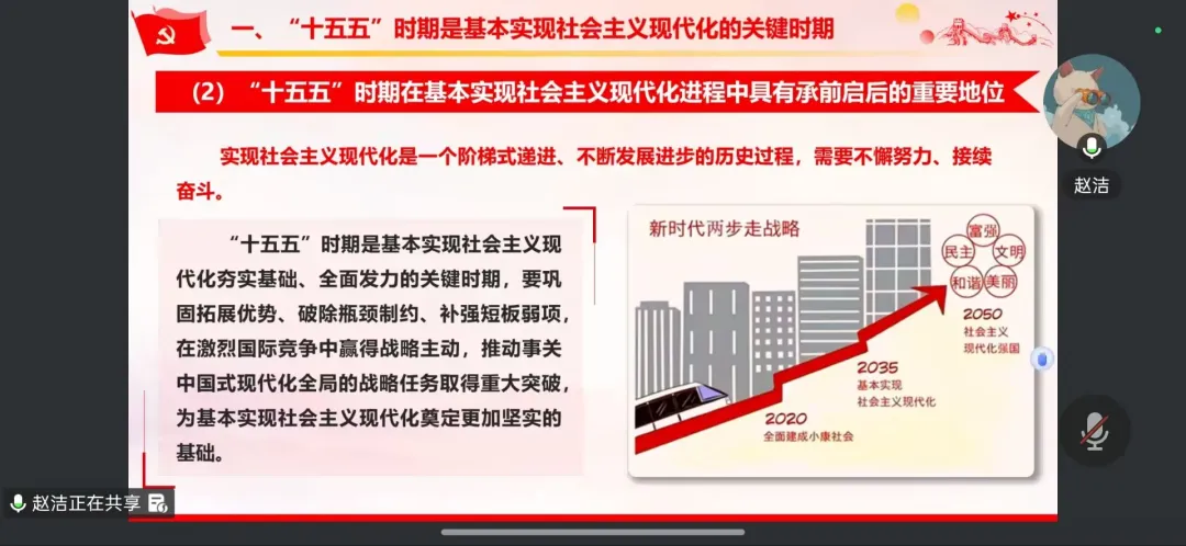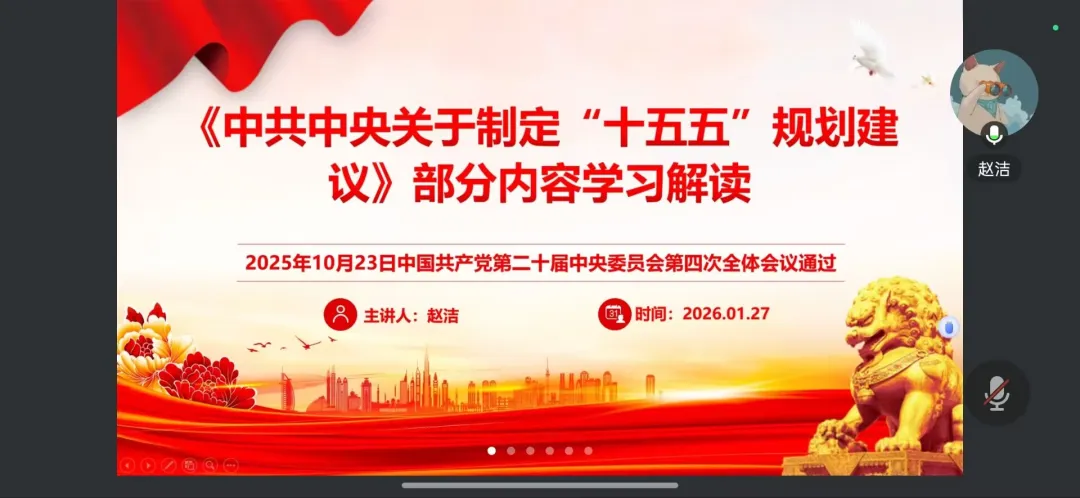 为深入学习贯彻党的二十届四中全会精神,准确把握“十五五”规划建议的核心要义,建筑与土木工程学院学生第五党支部于2026年1月27日13:00在线上开展了以“《中共中央关于制定‘十五五’规划建议》部分内容学习解读”为主题的党课学习。本次党课学习由支部书记赵洁主讲,全体党员同志参与学习。