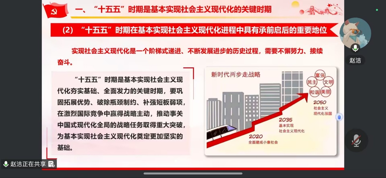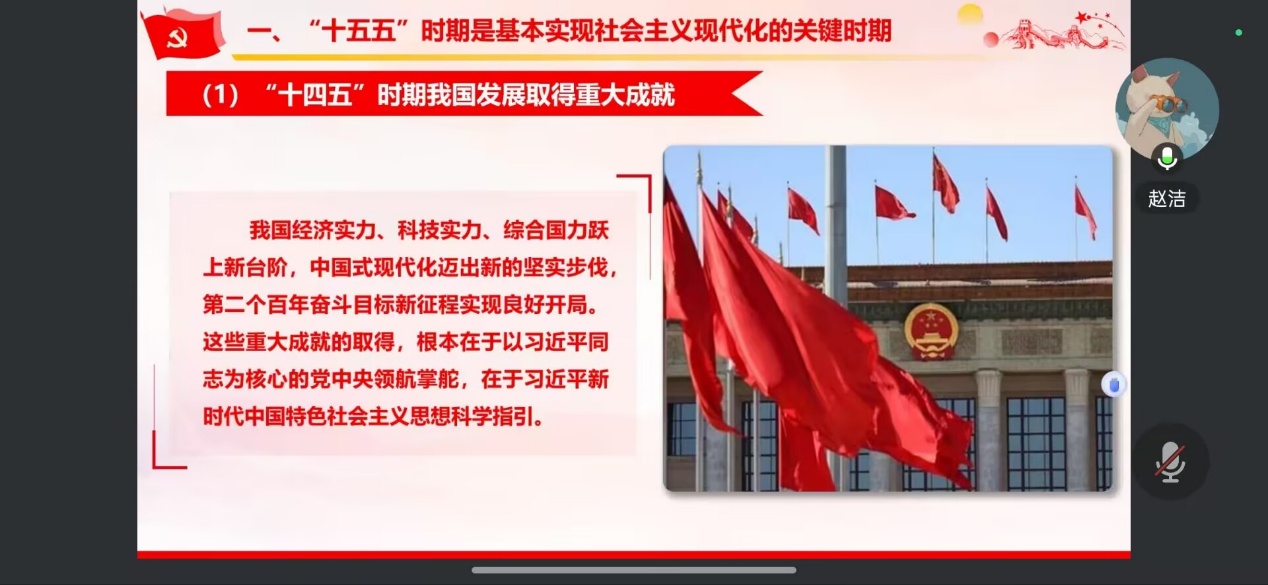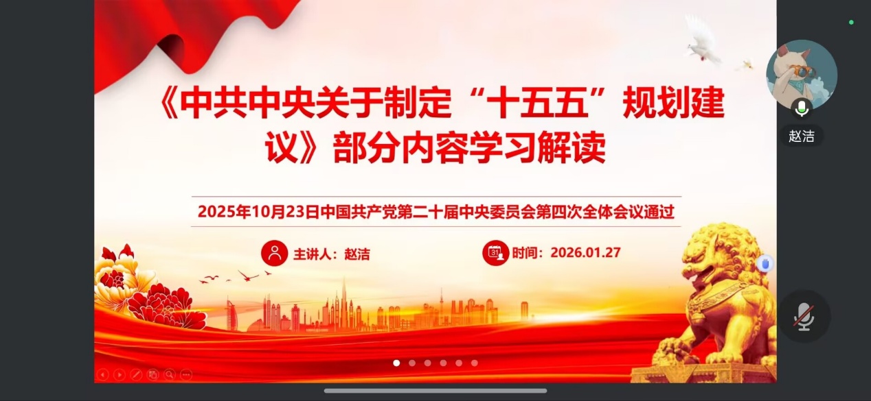 为深入学习贯彻党的二十届四中全会精神,准确把握“十五五”规划建议的核心要义,建筑与土木工程学院学生第五党支部于2026年1月27日13:00在线上开展了以“《中共中央关于制定‘十五五’规划建议》部分内容学习解读”为主题的党课学习。本次党课学习由支部书记赵洁主讲,全体党员同志参与学习。 会议伊始,支部书记赵洁围绕《中共中央关于制定“十五五”规划建议》这一主题展开深入讲解。她强调“十五五”时期是基本实现社会主义现代化的关键时期,具有承前启后的重要地位,规划明确以推动高质量发展为主题,以改革创新为根本动力,为我们指明了前进方向。她结合建筑与土木工程专业特点,详细阐述了“建设现代化产业体系”、“发展新质生产力”等战略目标与专业发展的紧密联系,从新型基础设施建设到绿色建筑升级,从智能建造技术应用到城乡建设提质,指出这些战略部署为专业学习拓宽了实践场景、注入了创新动能,让党员们深刻认识到国家发展规划与自身成长成才息息相关。 紧接着,在谈及青年党员如何践行规划精神时,支部书记赵洁指出,必须做到“三个结合”才能将规划要求落到实处。她强调要把理论学习与专业实践相结合,立足建筑专业所长,主动对接新型建筑材料、建筑数字化等行业前沿,把专业能力练扎实;要把党建引领与成长成才相结合,严格落实“三会一课”制度,积极参与“党建+学风建设”等活动,在学业帮扶、红色研学中锤炼党性;更要把个人发展与国家需求相结合,瞄准行业数字化转型和绿色化升级方向,无论是就业创业还是继续深造,都要将个人理想融入国家建设大局。 最后,支部书记赵洁对此次党课学习进行了总结。她强调,作为新时代青年党员,应该在有信仰、有韧劲、有情怀、有底线等方面严格要求自己,展现新风貌、新姿态、新作为。作为建筑与土木工程学院的学生党员,我们不仅要深入专业领域刻苦钻研,掌握智能建造、绿色建造等新技术,更应积极在服务国家战略中贡献自己的智慧和力量。将规划精神深植于学习和生活的每一个角落,通过扎实的专业学习提升综合素质,充分发挥党员的先锋模范作用,引领并带动周围同学共同进步,在“十五五”规划的新征程中展现青年担当。 通过此次党课学习,建筑与土木工程学院学生第五党支部全体党员同志对“十五五”规划内容有了更为清晰的认识和理解。党员同志们纷纷表示,将认真学习规划内容,结合自身专业特点明确发展方向,把国家发展需求与个人成长结合起来。在今后的学习和生活中,将以更加务实的态度刻苦钻研专业知识,积极参与学院各项活动,主动服务身边同学,努力提升自身综合素质,为学院发展贡献自己的一份力量,以实际行动展现新时代学生党员的责任与担当。