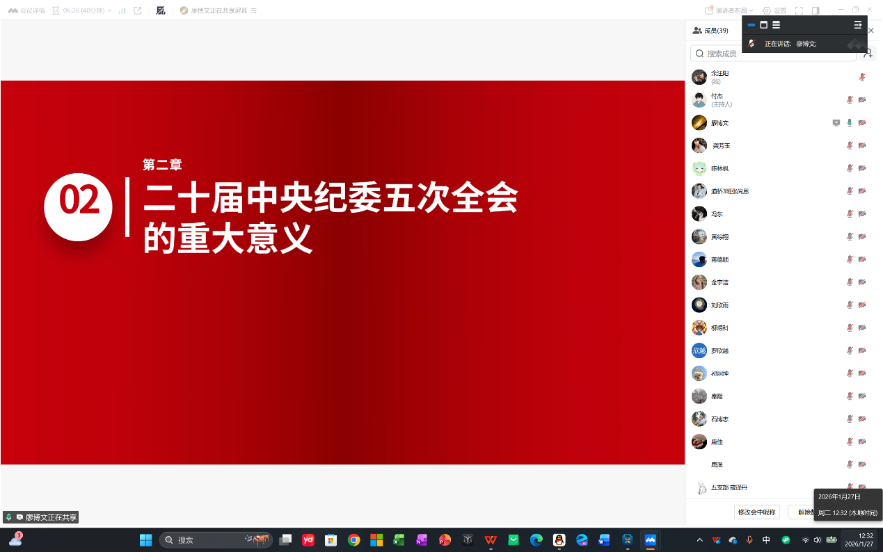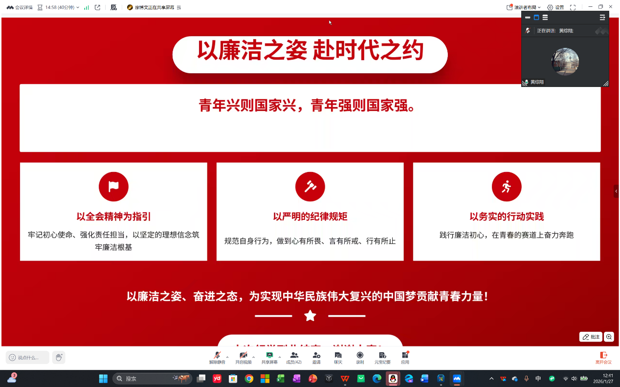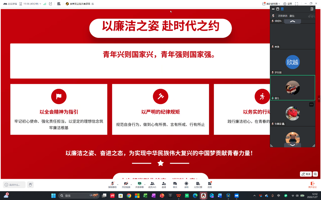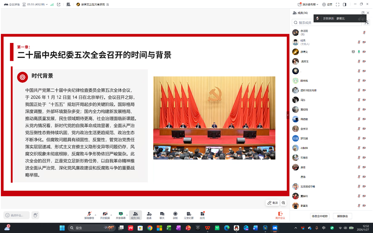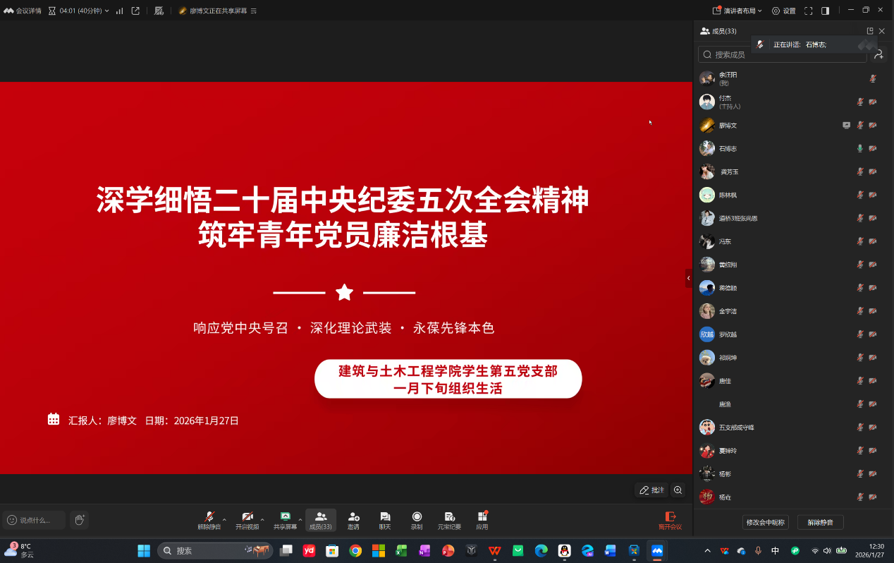 为深入学习贯彻二十届中央纪委五次全会精神,强化青年党员廉洁自律意识,筑牢拒腐防变思想防线,建筑与土木工程学院学生第五党支部于2026年1月27日12:30以线上形式召开“强初心筑根基,严把发展关口”为主题的组织生活。此次会议由石博志同志主持,学生第五党支部书记赵洁以及支部全体党员参加。 会议伊始,廖博文同志从全会召开背景与意义、核心要义、实践路径三个维度,系统解读二十届中央纪委五次全会精神。他指出,此次全会是纵深推进全面从严治党、深化党风廉政建设和反腐败斗争的重要部署,既聚焦整治群众身边腐败和作风问题,也为“十五五”时期各项事业发展提供了坚强纪律保障;同时梳理四大核心要求:强化政治监督、持续正风肃纪反腐、健全权力监督制约体系、系统治理新型腐败与“微腐败”,并结合青年党员身份,明确需深化理论武装、严守纪律规矩,以行动彰显党员本色。 在交流研讨环节,参会党员踊跃发言。黄综翔同志表示:“全会精神为青年党员廉洁自律指明了清晰方向,我们必须深刻认识全面从严治党的重要性与紧迫性,以此次学习为契机,进一步强化纪律意识、规矩意识,做到心有所畏、言有所戒、行有所止。”唐佳同志谈到:“作为新时代青年党员,我们应从点滴小事筑牢廉洁防线,知敬畏、存戒惧、守底线,切实把全会精神融入日常学习生活。同时要主动反思自身在理论学习深度、廉洁自律细节把控等方面的不足,立足岗位严守纪律规矩,以实际行动践行党员使命。” 会议最后,支部书记赵洁作总结发言,指出本次学习旨在引导青年党员筑牢廉洁根基。她强调,全会于 “十五五” 开局关键阶段召开,为新征程全面从严治党、反腐败斗争提供关键指引,核心是强化政治监督、正风肃纪反腐,结合换届年特点完善权力监督体系,治理新型腐败和 “微腐败”;青年党员要将全会精神内化于心、外化于行,深化理论武装、强化实践担当,在学习科研和生活中恪守廉洁底线。未来,支部将持续巩固学习成果,引导全体同志以廉洁之姿赴时代之约,同时在新春将至之际,支部书记祝愿各位党员同志新春愉快、万事顺意,学业顺遂,新的一年坚守初心、笃行实干,尽职尽责永葆清正廉洁作风。 此次组织生活的召开,进一步推动二十届中央纪委五次全会精神在青年党员群体中落地生根,有效强化了支部党员的廉洁自律意识和责任担当,为支部党风廉政建设持续向好发展奠定了坚实基础。