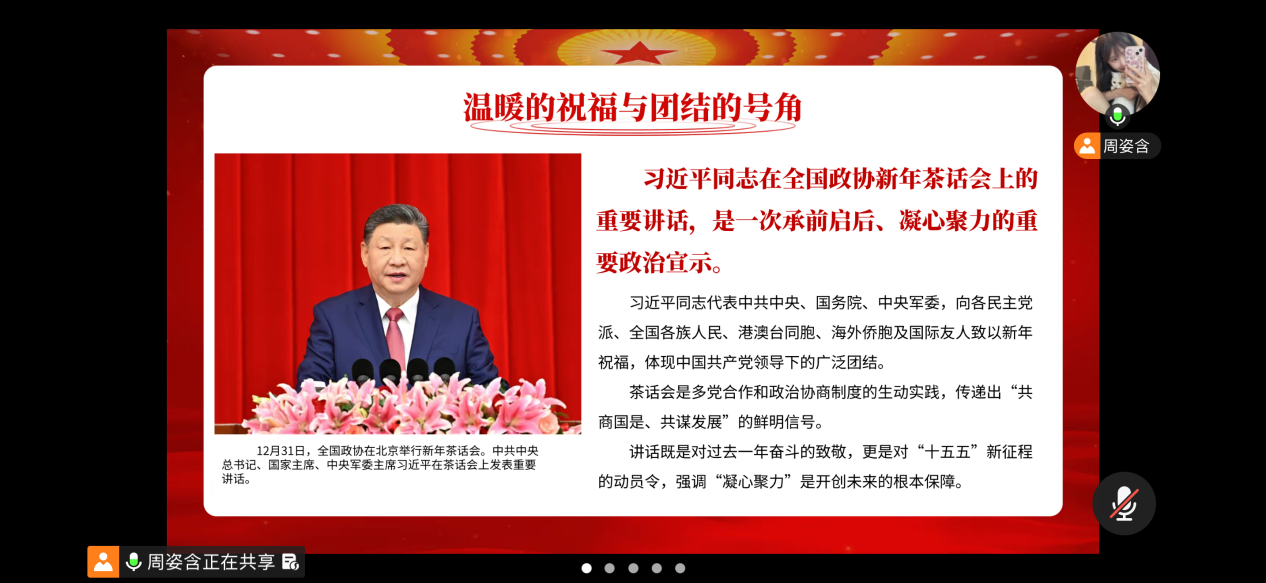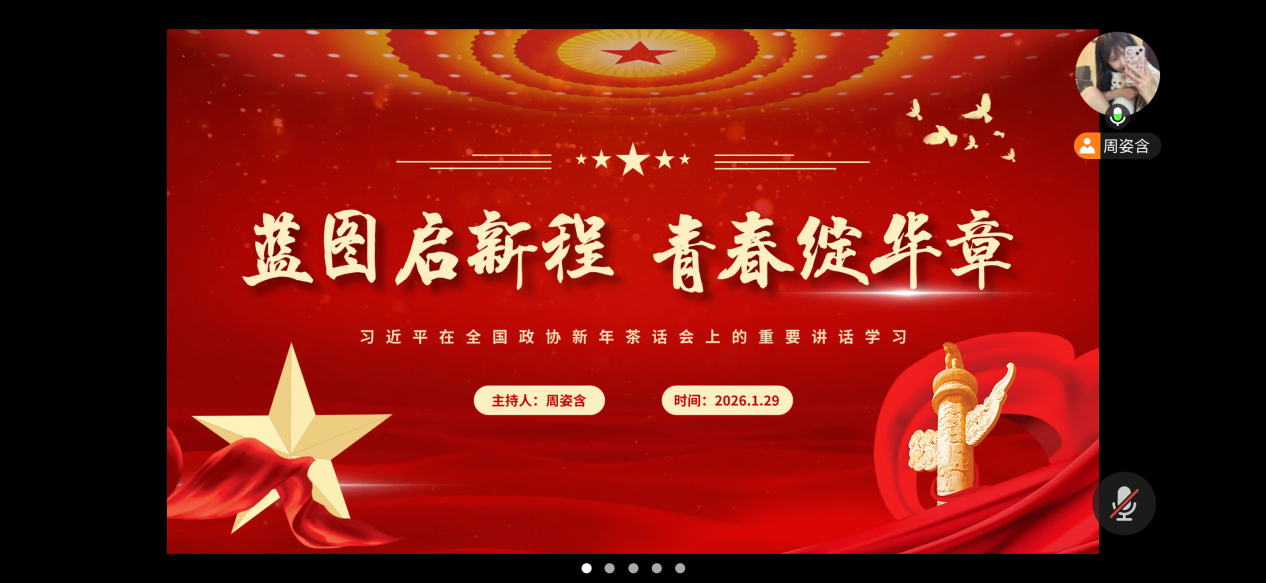 为深入学习领会习近平总书记在全国政协新年茶话会上的重要讲话精神,凝聚思想共识,激发奋斗热情,建筑与土木工程学院学生第一党支部于2026年1月29日中午12:20在线上开展以“蓝图启新程,青春绽华章”为主题的党日活动。本次会议由周姿含同志主持,支部书记梅本婷与全体党员参加。 会议伊始,周姿含同志带领全体党员学习习近平总书记重要讲话。讲话回顾了2025年及“十四五”成就,强调经济、科技、国防和综合国力增强,中国式现代化取得进展。同时,讲话指出2026年“十五五”的开年意义,部署稳中求进、新发展理念、高质量发展等任务,号召全党全国各族人民团结奋斗,开创中国式现代化新局面。 在学习中,支部党员深刻认识到,要将讲话精神内化于心、外化于行,把个人专业成长融入国家基础设施建设和城乡发展大局。讲话既是对过去奋斗历程的致敬,更是面向新征程的动员令,体现了党中央高度的战略定力和对发展规律的深刻把握,为青年党员指明了前进方向、注入了强大信心。 随后,与会党员交流分享学习内容。周思含同志结合专业实践表示,要将个人成长融入国家发展,紧跟时代节奏,掌握专业知识,投身前沿领域,在实践中创新实干,为中国式现代化贡献青春力量,要坚定理想信念,提升综合能力,将讲话精神转化为勤奋学习、服务社会的实际行动。 最后,支部书记梅本婷总结指出,习近平总书记讲话高远丰富,具有政治性、思想性和指导性。她强调全体党员要深入学习,牢记“蓝图绘就,奋进当时”号召,珍惜机遇,发扬斗争精神,锤炼实干作风,努力成长为有理想、敢担当、能吃苦、肯奋斗的新时代好青年,在强国建设、民族复兴中绽放青春。