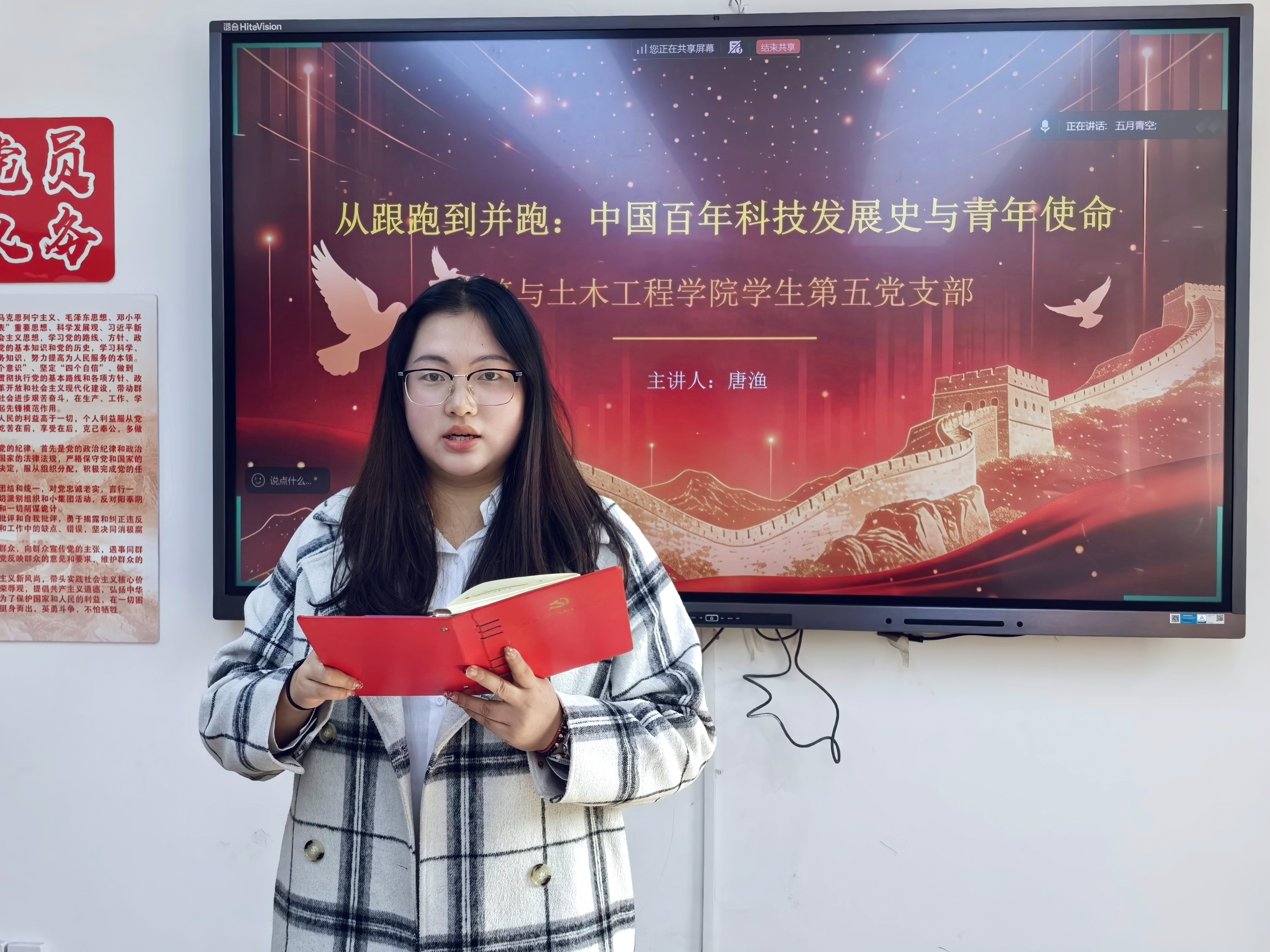 为深入学习中国科技百年从跟跑到并跑的奋进历程,感悟先辈自力更生、攻坚克难的精神,引导广大青年坚定报国志向、勇担时代使命,建筑与土木工程学院学生第五党支部于2026年3月11日15:00,在一教402教室开展以“从跟跑到并跑:中国百年科技发展史与青年使命”为主题的组织生活。本次会议由付杰同志主持,唐渔同志领学,学生第五党支部书记赵洁及支部全体党员同志参会。 会议伊始,唐渔同志带领全体党员回顾中国百年科技从跟跑到并跑的壮阔征程:从洋务运动的艰难探索,到“两弹一星”铸就国之重器,再到“863计划”的技术突破,直至新时代在载人航天、高铁、5G、新能源等领域实现并跑乃至领跑。这段历程生动展现了一代代科研工作者自力更生、艰苦奋斗、为国奉献的精神品格,唐渔同志借此深入解读新时代科技自立自强的战略部署,明确青年当以担当锚定航向,在国家创新发展大局中找准成长坐标,让青春力量精准对接高水平科技自立自强的时代需求。 随后,唐渔同志结合百年科技演进脉络与青年使命,深入传达习近平总书记关于“青年是祖国的前途、民族的希望、创新的未来”的殷切嘱托,强调科技创新正处于关键攻坚阶段。他指出,青年既是建设科技强国的生力军,也是关键核心技术突破的中坚力量:既要立足专业所长,在重大工程与基础科学领域实干笃行,锤炼过硬本领;更要赓续科研精神,主动肩负起科技自立自强的时代重任,将个人理想融入国家发展大局,以实际行动在实现中国梦的征程中放飞青春梦想。 在党员感悟分享环节中,闫润璋同志谈到:“回望百年科技路,从‘两弹一星’的跟跑奠基,到如今高铁飞驰、北斗组网的并跑超越,一代代科学家以无悔付出铸就强国底气。如今接力棒传至吾辈手中,作为大学生党员,当传承这份科创报国志,在‘卡脖子’难题前敢为人先,以青春力量助推科技自立自强,在伟大复兴征程中跑出我们的加速度。”张清凤同志则表示:“回望我国科技事业从跟跑到并跑的百年历程,科研先辈们的坚守与奉献令人深受鼓舞。作为学生党员,我深刻认识到‘青年使命’不是一句口号,而是要落实到具体行动中,未来将立足专业特色,以服务国家建设为目标,扎实学好专业知识,努力成长为能为科技自立自强、国家基础设施建设贡献力量的青年党员。” 会议最后,支部书记赵洁进行总结。她强调,本次组织生活系统回顾了我国科技事业百年奋进历程,进一步明晰了新时代青年党员在科技自立自强征程中的使命担当,作为青年党员,更应传承科学家精神,立足专业实干笃行。她希望同志们能够坚定理想信念,将个人理想融入国家发展大局;锤炼过硬本领,把学习成果转化为服务国家建设的能力;强化担当作为,在专业学习、科研实践、志愿服务中发挥先锋模范作用。